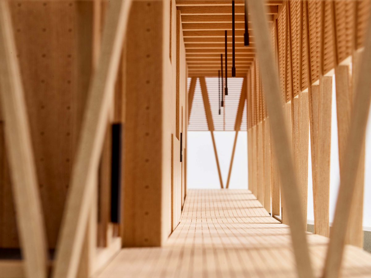 The art pavilion possesses a simple building structure consisting of two floors. The central storage and exhibition room receives an entrance thrue the surrounding arbor, which protects the core of the building from varying weather conditions. The two windtraps on the shorter sides take over the role as climatebuffers. The basement contains the technical and operational rooms.