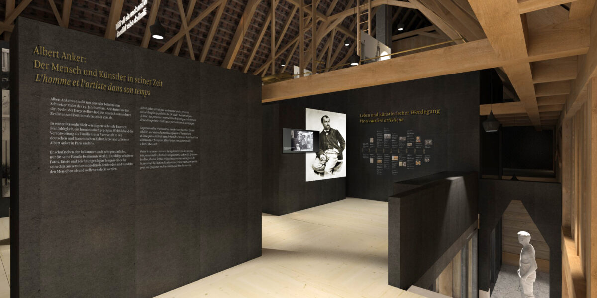 La salle d’accueil à la grange devient le nouveau cœur du Centre Albert Anker. C’est là que les visiteurs seront accueillis et informés. Dans l’ancienne étable adjacente, un espace polyvalent sera aménagé, qui pourra être utilisé comme bistrot ou pour la médiation culturelle. Les espaces existants ainsi que les nouveaux aménagements offrent un parcours varié et passionnant à travers les combles impressionnants d’une ferme typique de la région datant vers 1800. Anker et son époque y sont présentés aux visiteurs dans le cadre d’une exposition permanente moderne.