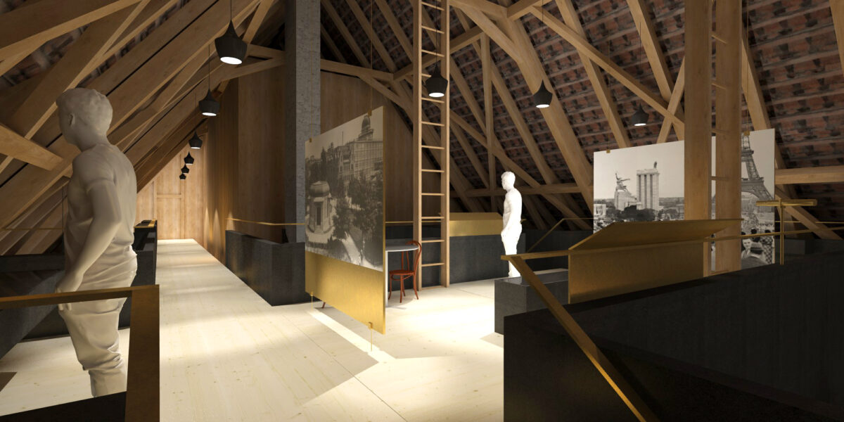 Les plans d’étage du bâtiment résidentiel montrent la structure et les changements dans l’organisation des espaces. La partie ouest avec l’appartement historique et l’atelier ne fera pas l’objet de travaux. La partie économique et le grenier seront nouvellement aménagés et utilisés pour l’exposition permanente. L’appartement de service existant dans la partie orientale sera rénové et agrandi.